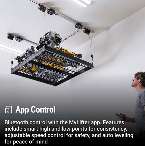With a mesh wire platform, the 4×4 Platform Storage Lifter can lift awkward and heavy items, such as lawn tools, woodworking tools, totes, and holiday decor. All four MyLifter’s sync to give you a smooth and seamless lift and lower, even with multiple items.
