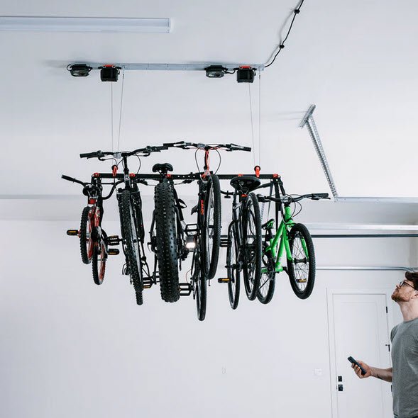 Convenient organization and storage for your E-bike, mountain bike, racing bike, BMX bike, or any other bike you can think of. Options include a 6, 3, and a single bike lifter.