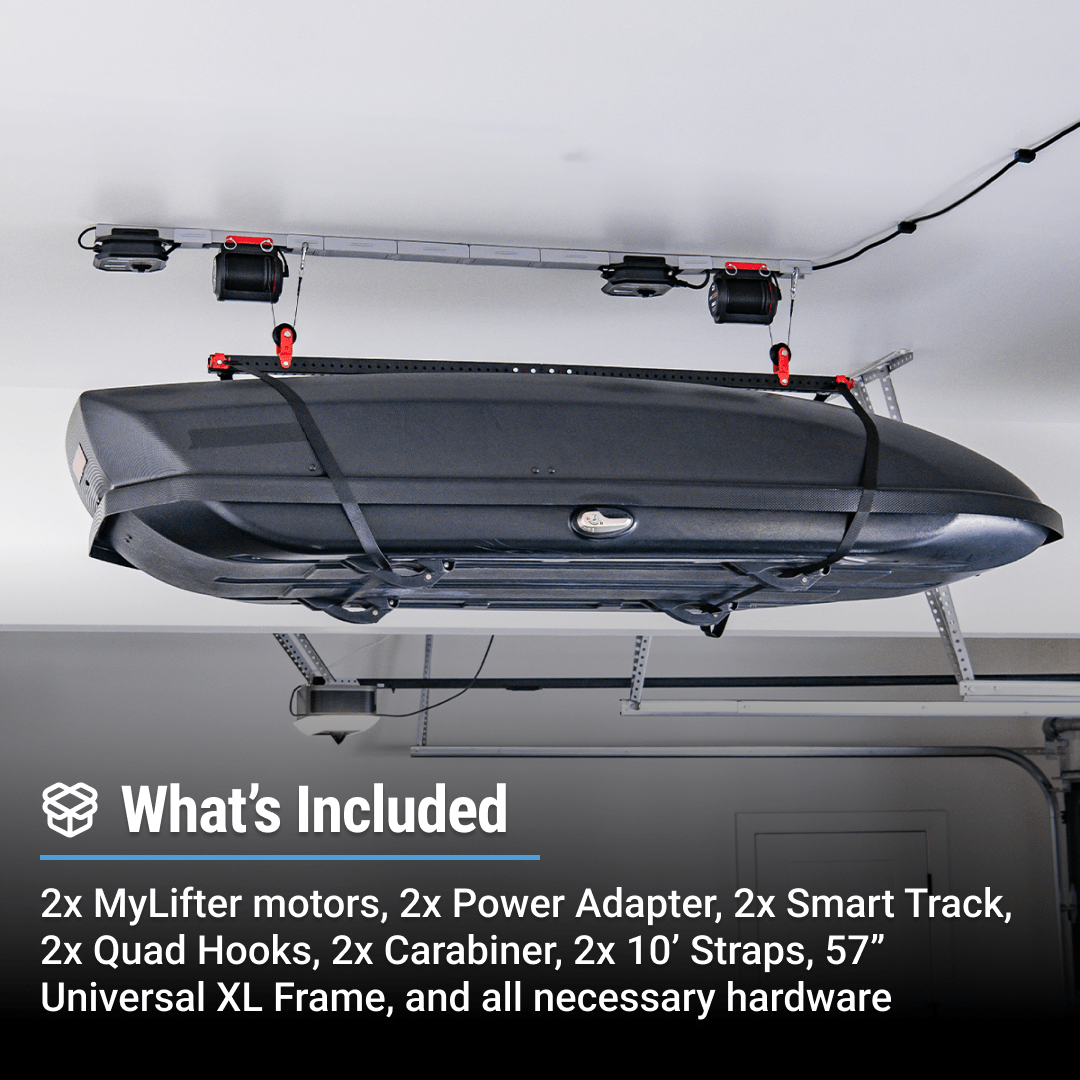 Maximize your garage space with the Universal XL Lifter by storing large items on the ceiling. The Universal XL can lift 100 lbs including the lifting accessory. Move items out of your walkways or parking spots. Lift and store an array of different items. The possibilities are endless. Lift anything from paddleboards, a Thule roof box, holiday decor, a wheelbarrow, and more.